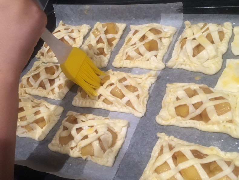 ▼焼き色が付くよう、シリコン刷毛で卵液をペタペタ。助手:「やりたいぃ~°˖✧◝(⁰▿⁰)◜✧˖°」