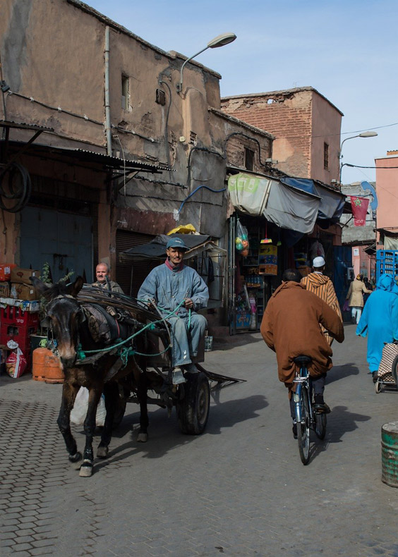 実はモロッコ、クチのような観光用馬車だけでなく、ロバがひく貨物用馬車も道路を走ります。