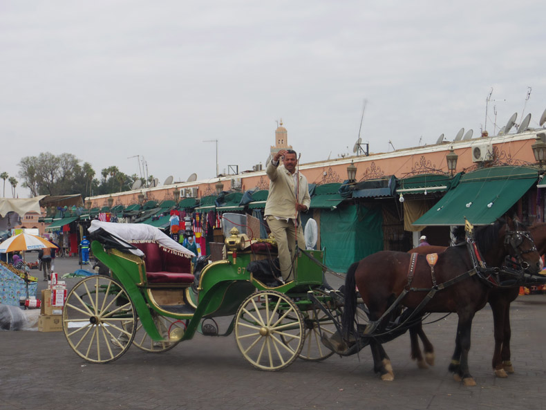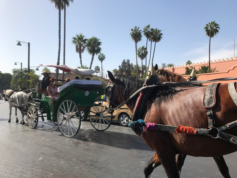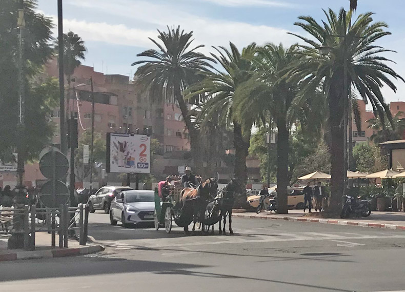 マラケシュではバス渋滞ならぬ「馬車渋滞」もよくある光景。