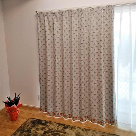 裏から見ても可愛いデザインが人気のカーテンでございます。