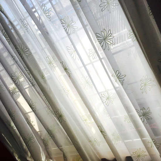 ミラーレースのカーテンに大きなお花柄の刺繍が施されている