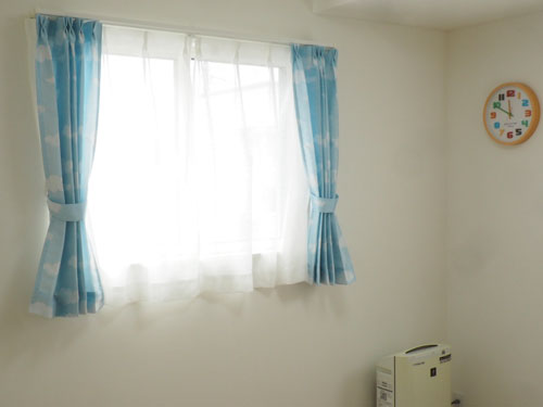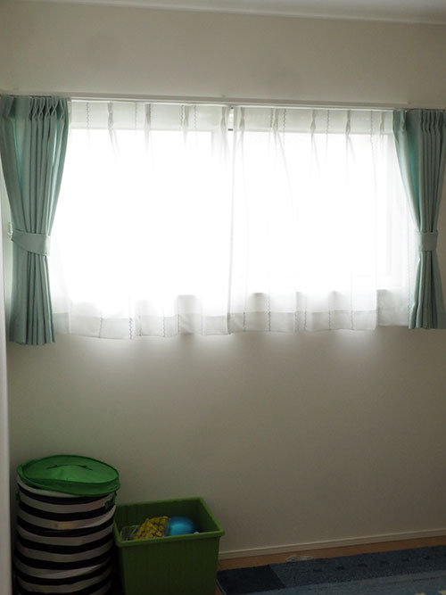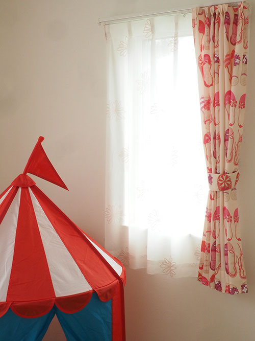 将来的に可愛すぎるカーテンだとイヤになるかなとも思い悩みましたが、今はキッズルームとして使ってるので、ぷっくりモールのようなデザイン付きのレースカーテンにしたことで、ドレープは無地でも控えめな可愛らしさ、将来的にも可愛くなりすぎないカーテンになったと思います。