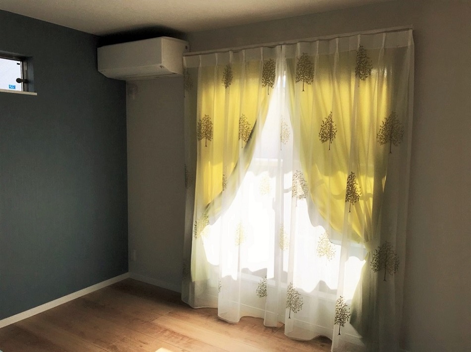 癒し効果のあるライムグリーンと、木立柄の刺繍のレースカーテンをかけて頂くことで、とてもリラックス空間になりました♪