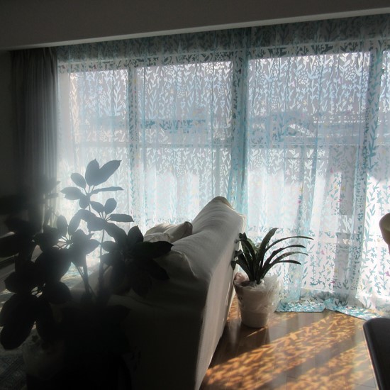 爽やかなブルーグリーンのような色合い、光が当たると、床にカーテンの柄の影ができて、とても素敵です。