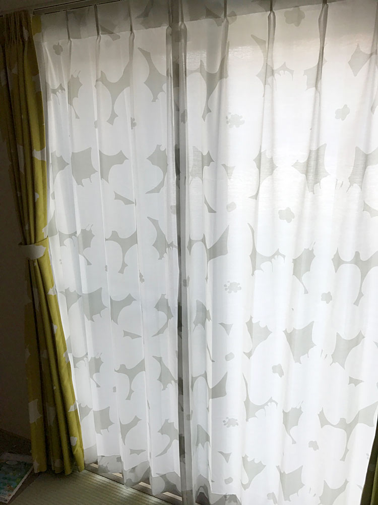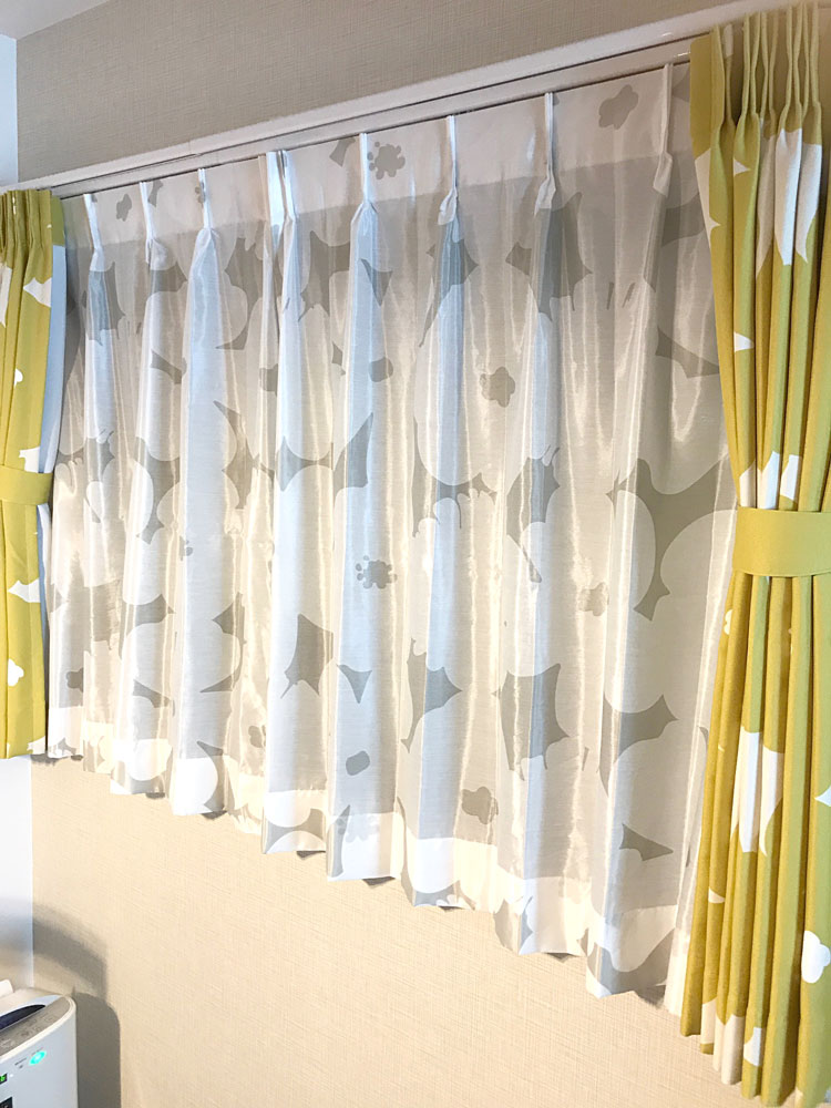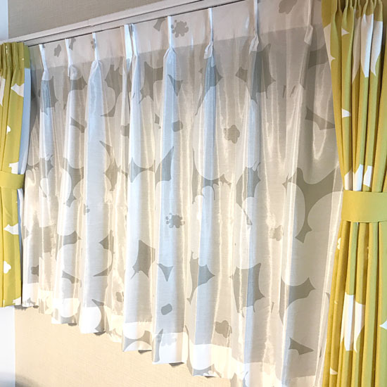 お客様より<北欧調>100サイズ・遮熱・遮像・北欧デザインカーテン <シャイニーベール テュット ペアレースカーテン><北欧調>100サイズ・遮光2級・北欧デザインカーテン <テュット イエロー>のお写真とご感想をいただきました!