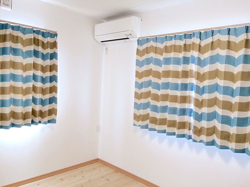 ご寝室の<matka – マトカ ブルー>は北欧らしいダイナミックな柄にブルー×ブラウンのオシャレな組み合わせがとっても素敵なカーテンですね!それだけではなく、1級遮光のタイプになるのでしっかりと光を遮断するので夜はグッスリお休み頂けます(-_-)zzz