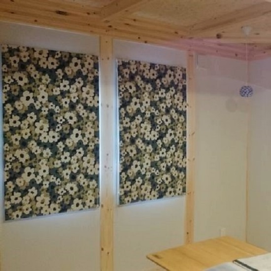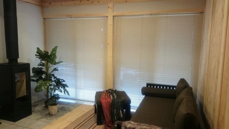 ストーブの周りは火の気があるためアルミのブラインドにしました。濃い色にし