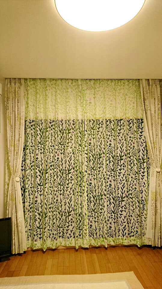 北欧カーテンシリーズより<ハーラ アイボリー>、透明感が美しいレースカーテンシリーズより<レインリーフ グリーン>のご感想を素敵なお写真と一緒に頂きました♪