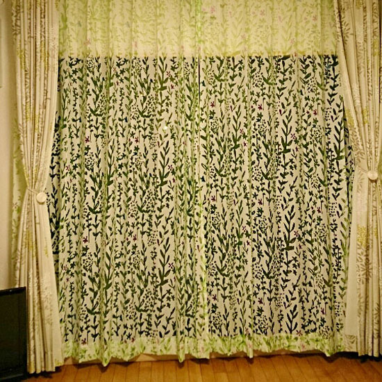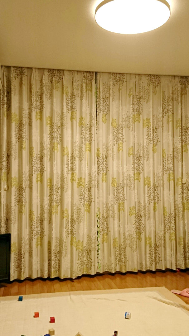 厚手のカーテンは電気を暗くすると、葉の柄のグリーン部分が目立たなくなり、違った表情のカーテンになります。シックな感じでそれはそれで、素敵です。