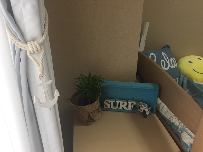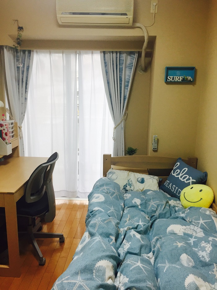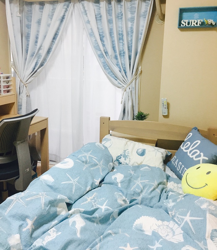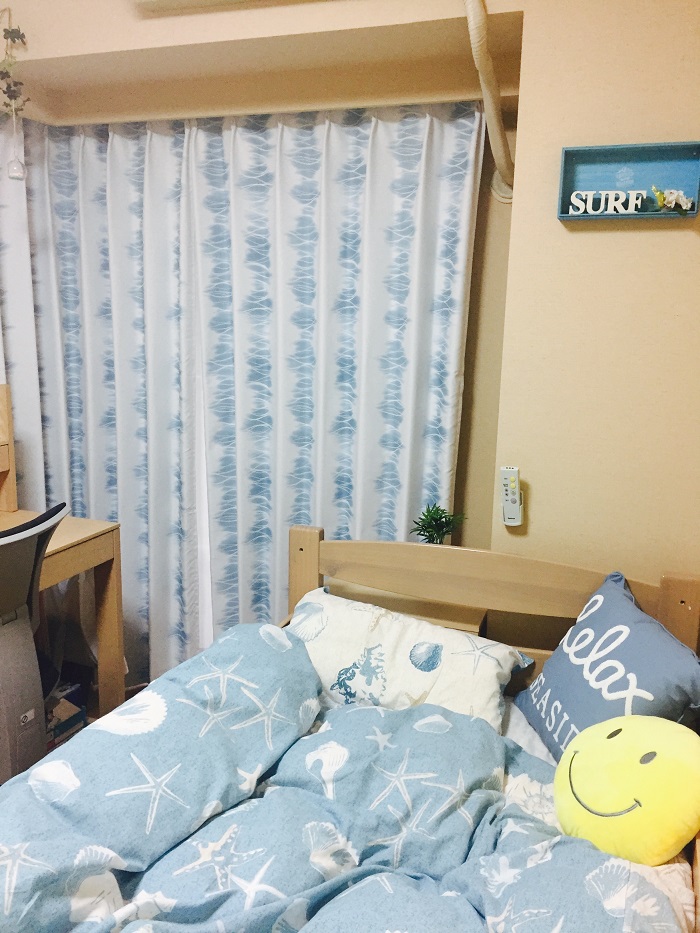 西海岸風の部屋をイメージしたリプルシーブルーのカーテン、ぐっと部屋のムードが変わり私も娘も喜んでおり