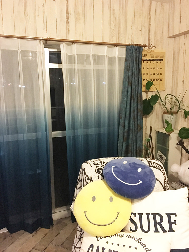 サンプルで、色をとても迷ったけど、この色にしてよかった、デニムの厚手カーテンとも、ちょうど良い感じで大満足