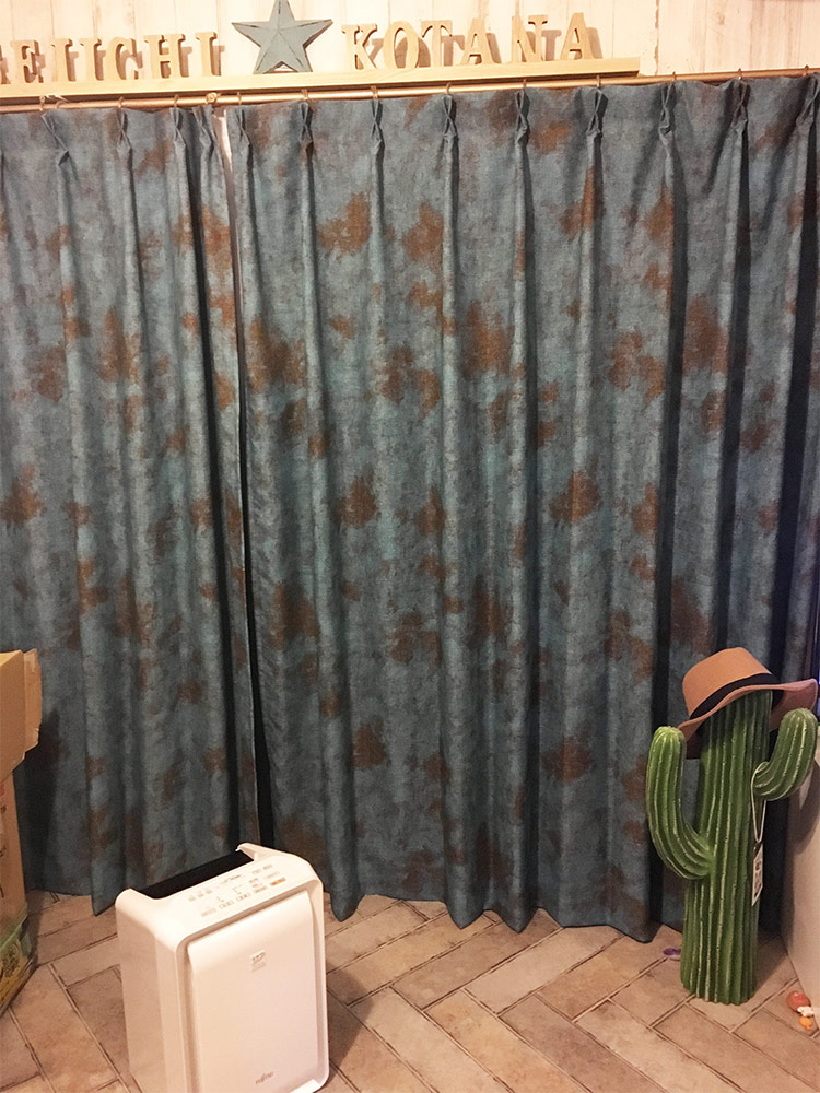 ワークデニムはデジタルプリントで本物の古いデニム生地に鉄サビがにじんだようなデザインを再現したオリジナルデザインのカーテンです d(⌒O⌒)