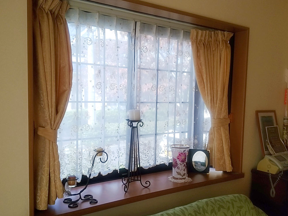 今回のお写真の様に1.5倍ヒダでも十分にエレガントで豪華さの有るカーテンですが、もっとお望みの方には2倍ヒダもご用意しております。