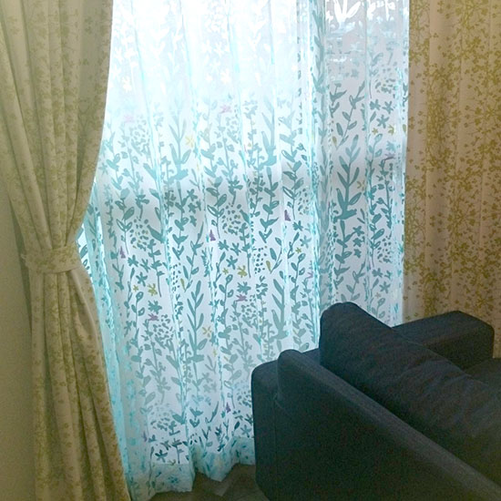 仰り通り、<レインリーフブルー>は朝と夜で見え方が違って見えて、とっても楽しいカーテンなんです♪