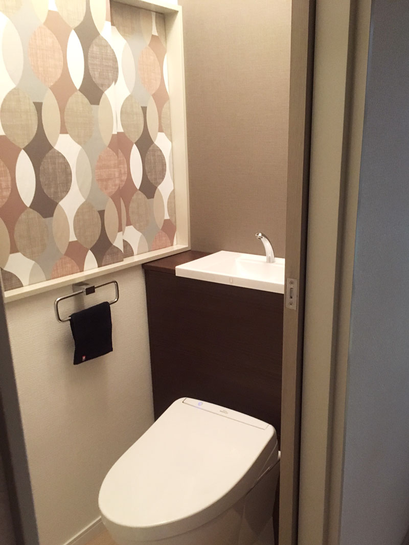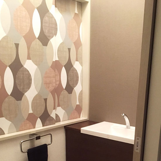 レストルームですが、ヒエッカブラウンでファブリックパネルを作り、部屋っぽい雰囲気になりました。