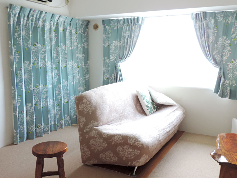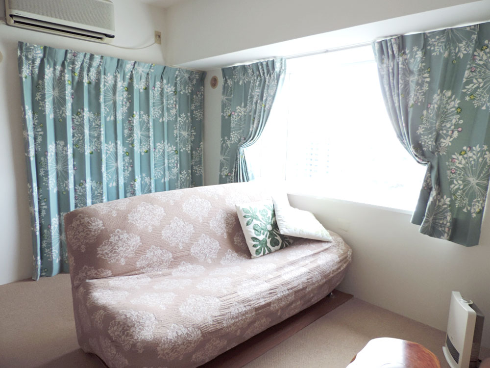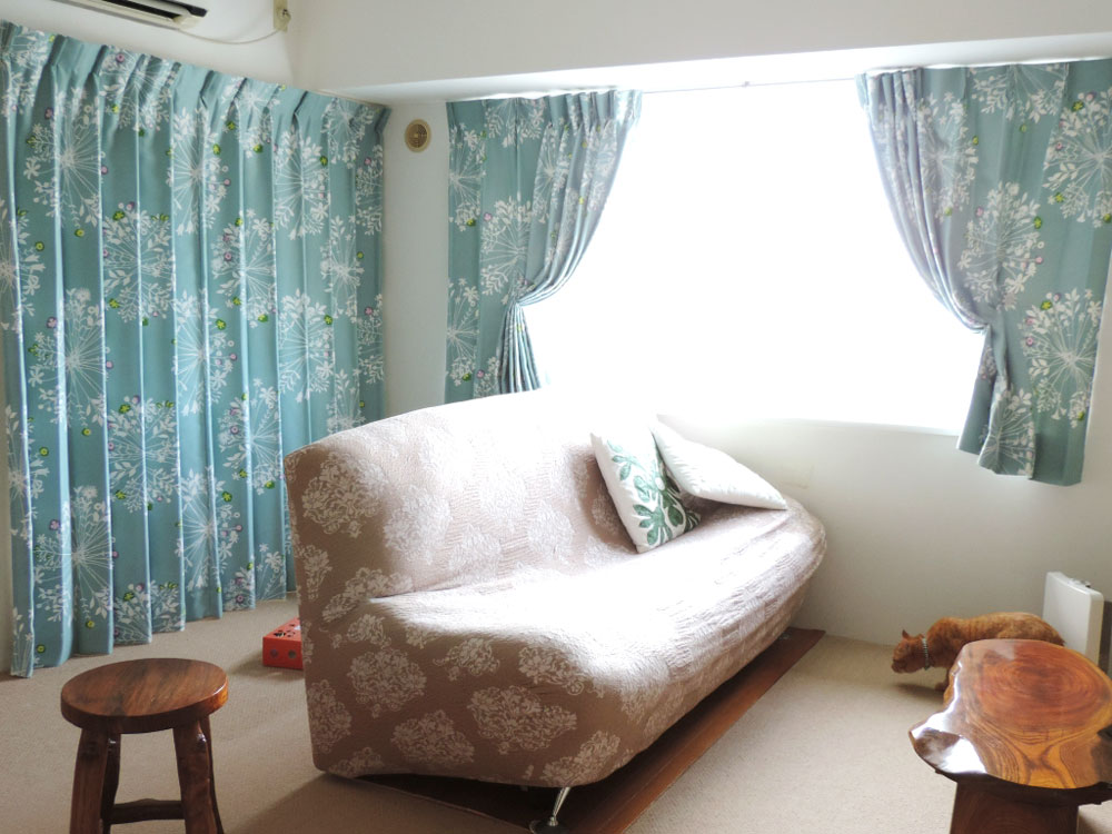 白ベースのカーテンからブルーグリーンのカーテンへ変えるとお部屋の雰囲気ががらっと変わりますね♪