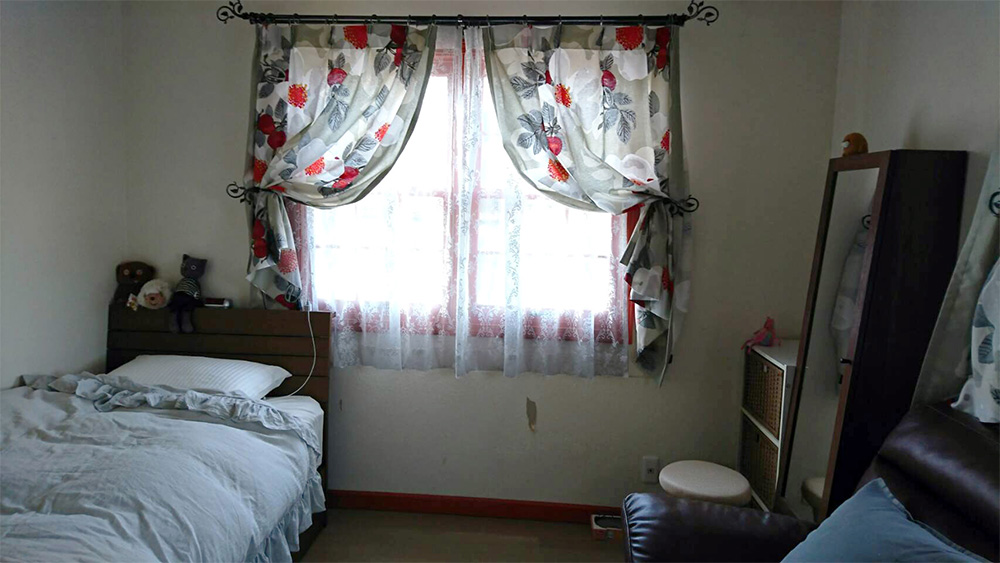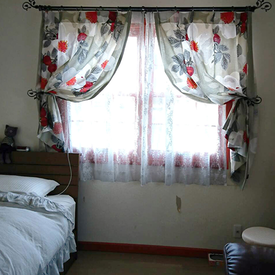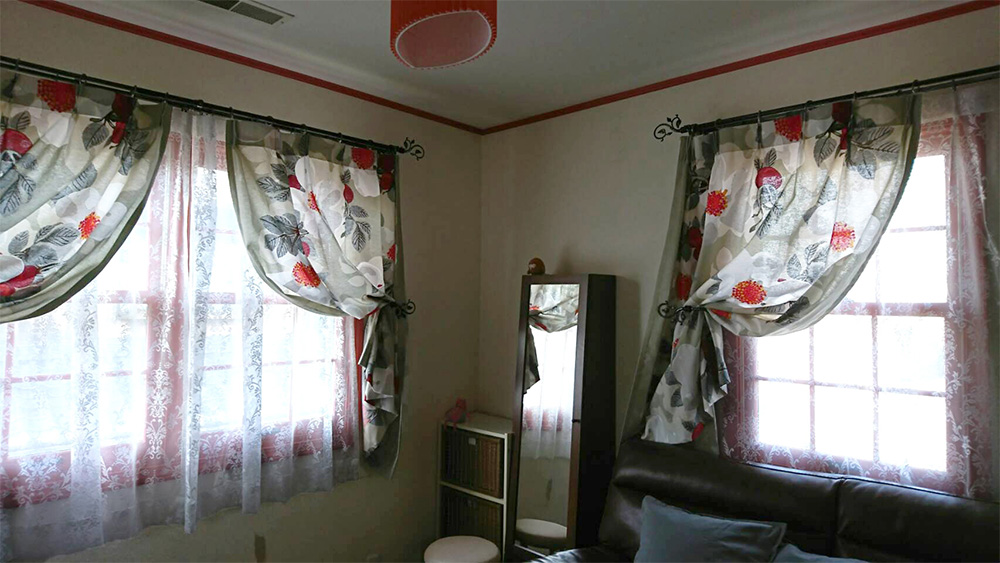 不満でしたが、素敵なカーテンで大人っぽく(?)仕上がりました。