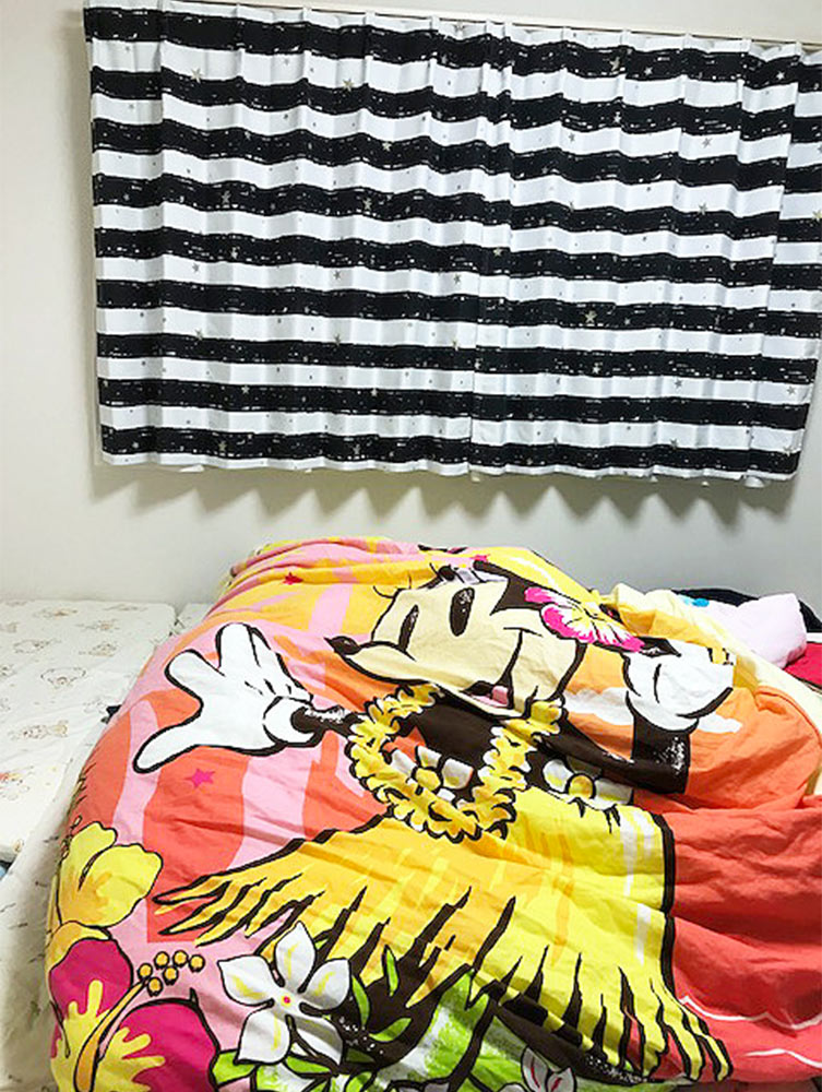 また、寝室にかけていただいている<マリンボーダー>は遮光2級のカーテンでございますので