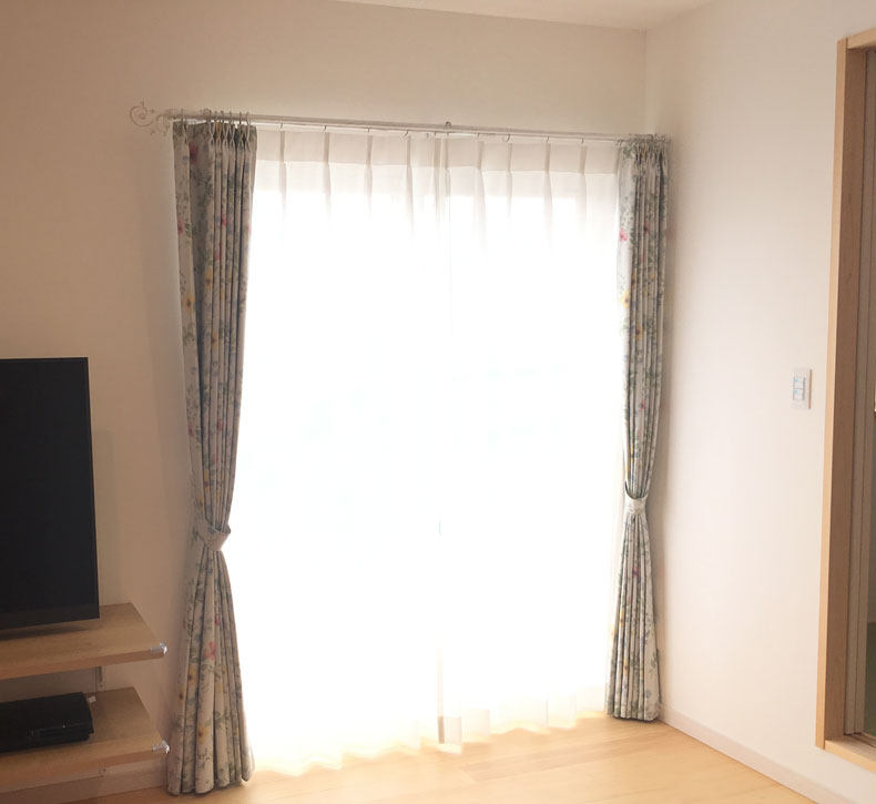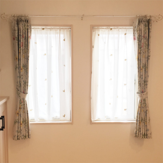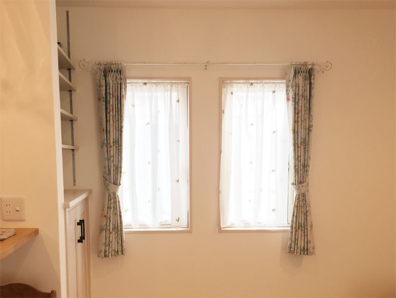 こちらはカーテンは2窓を1窓としてお使い頂き、レースは1窓につきそれぞれ1枚でつっぱり棒でお取り付け頂いております。