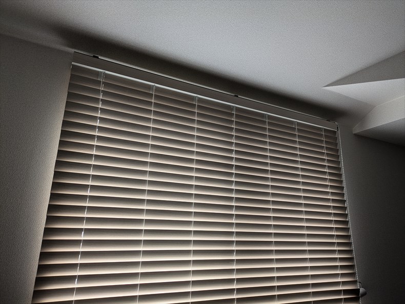 腰高窓はブラウンのブラインドから白系のウッドブラインドへ変えたのですが、お部屋を広く見せてくれますし