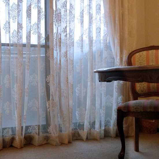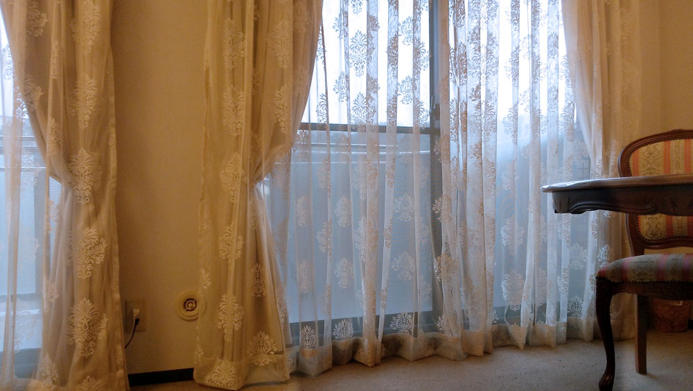 ダマスク柄のレースカーテン越しのベージュの遮光カーテンは