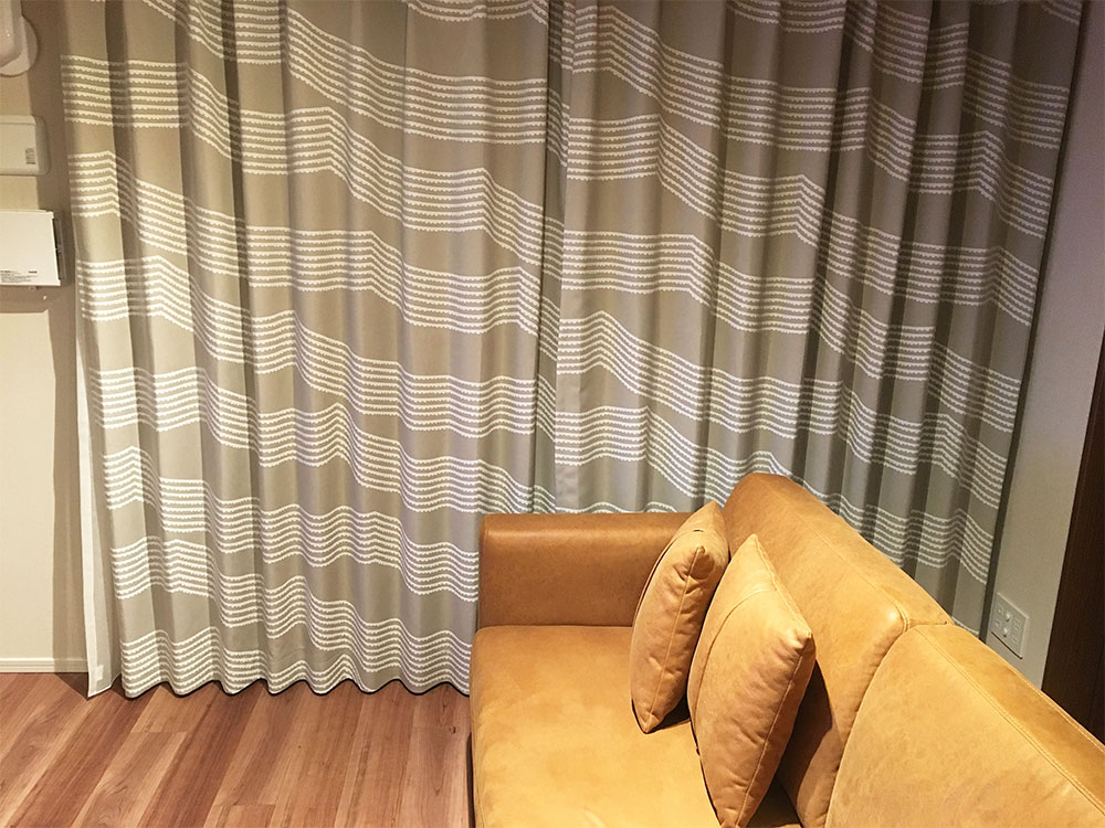 遮光機能+ボーダー+ベージュって、よくある既製品カーテンの香りがフワリと漂ってきそうですが、いただいたお写真を見てください!