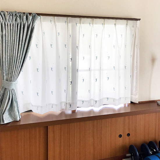 タツノオトシゴのレースのカーテンと、グリーンのカーテンを組み合わせました。