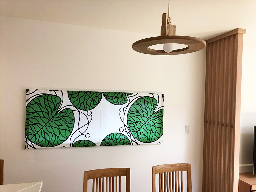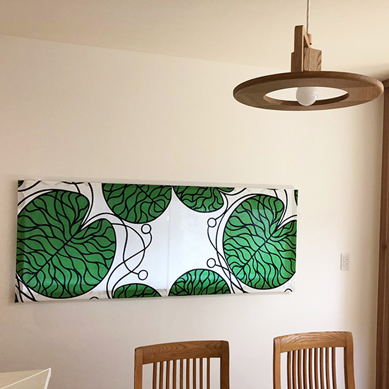 た。シェードをタペストリーのようにしたかったんですが、これが想像以上に素敵です!ダイニング側にはグリ