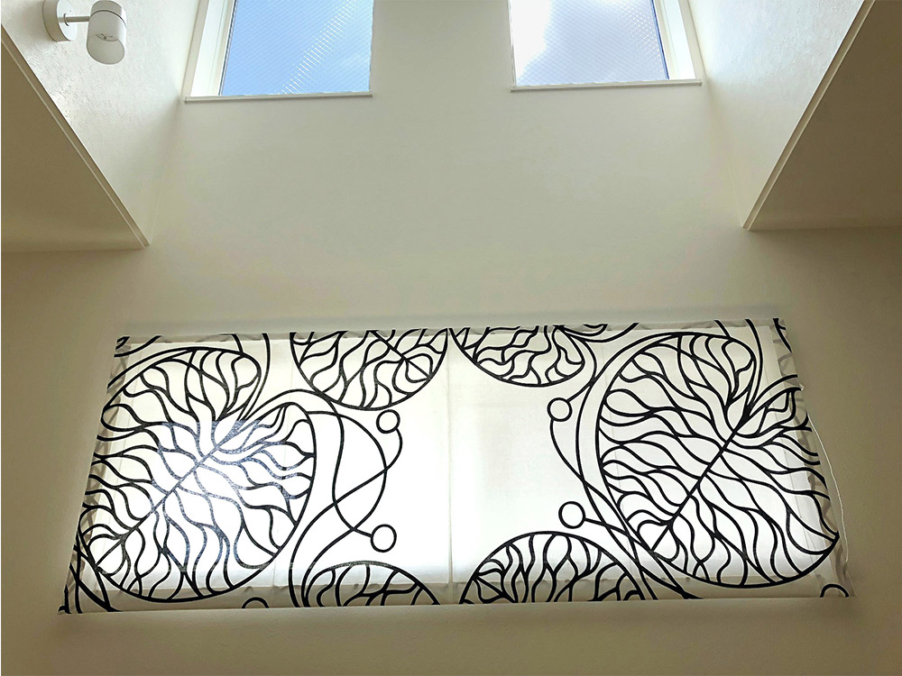 吹き抜けの下の窓のシェードも、太陽光が柔らかく入ってきて柄が引き立ちとてもお洒落です( *´艸`)