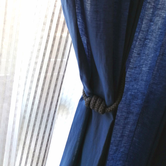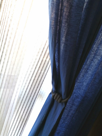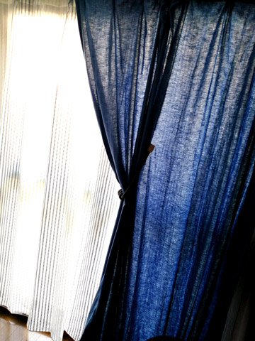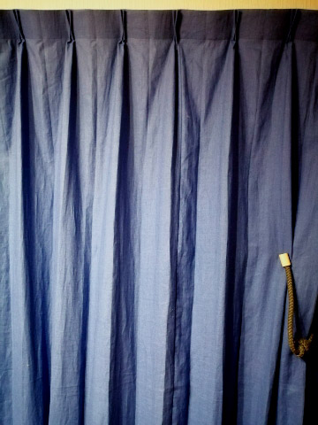 ブルーのカーテンは昼は麻の風合いがとてもナチュラルで素敵で、夜は落ち着いた印象になり、