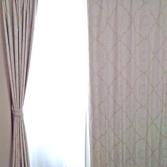 お選びいただいた<バークレイ ベージュ>はアクリル樹脂でコーティングしているカーテンなので防音・遮光超一級・形状記憶…