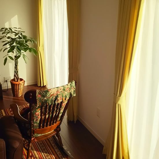 今回お客様がお選びいただいた<ナチュラルツイル イエロー>は、さっくりとした織りに、上品なツヤが特徴の非遮光カーテンです。