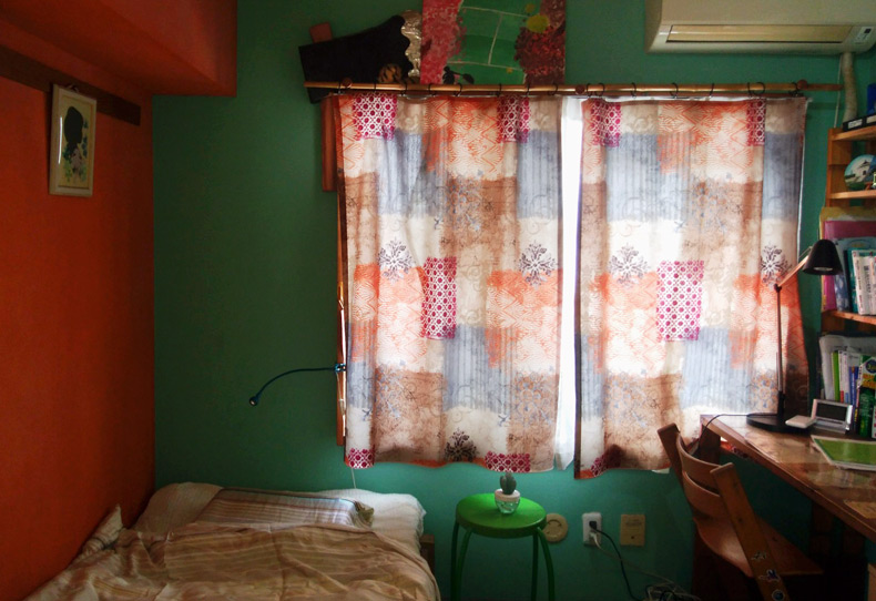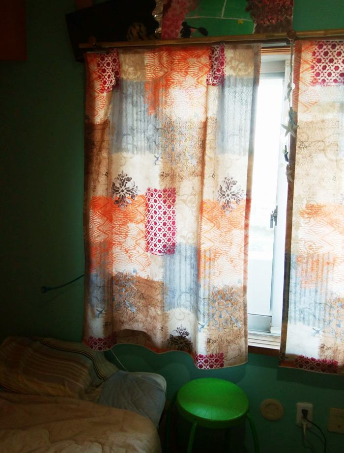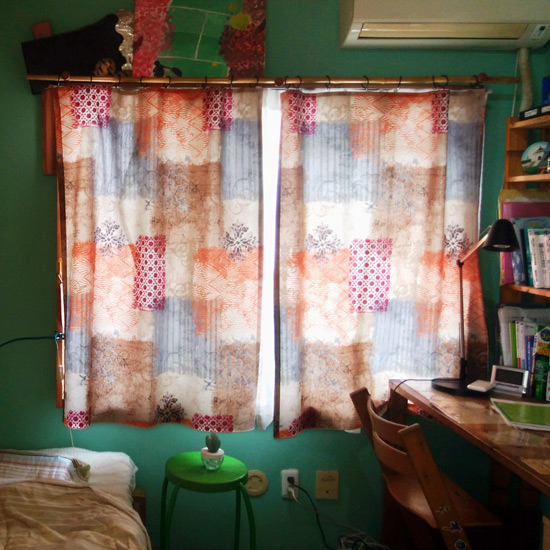 息子の部屋の個性的な壁の色に合うカーテンをようやく見つけました!