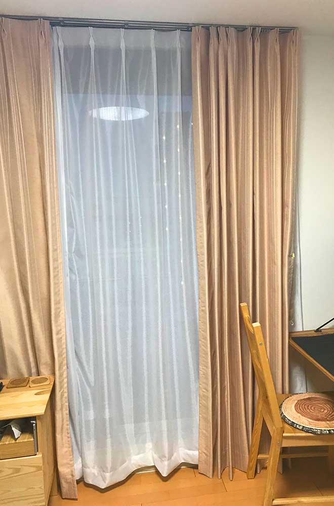 ウッド調で揃えた室内にマッチしています。期間のわからない単身赴任にもコストパフォーマンスまで満点で、まさに”びっくりカーテン”さんでした。