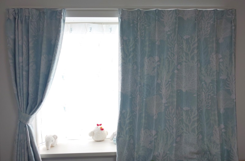 厚地カーテンはマリン柄で、落ち着きもあるかわいい水色です。