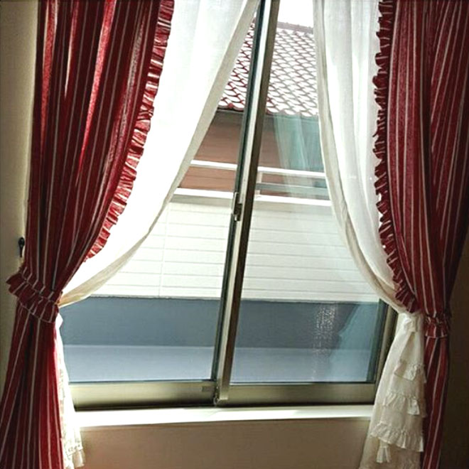 厚地カーテンは1階は青チェックの3段フリル、2階はストライプでネイビー、水色、赤で揃えた(^^)