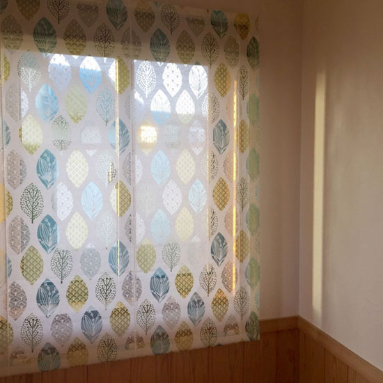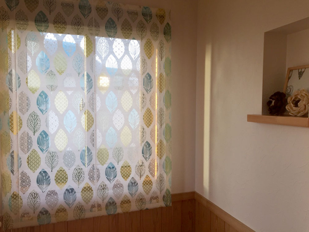 ダブルタイプのシェードでお選びいただいた生地は<リーフオーナメント ライトブルー><ユーカラー ライム(非遮光)>。