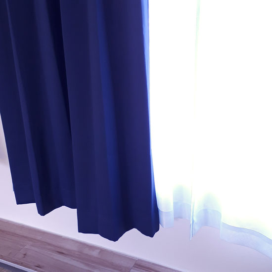 レースカーテンは水色、遮光カーテンは濃いブルーにしました。