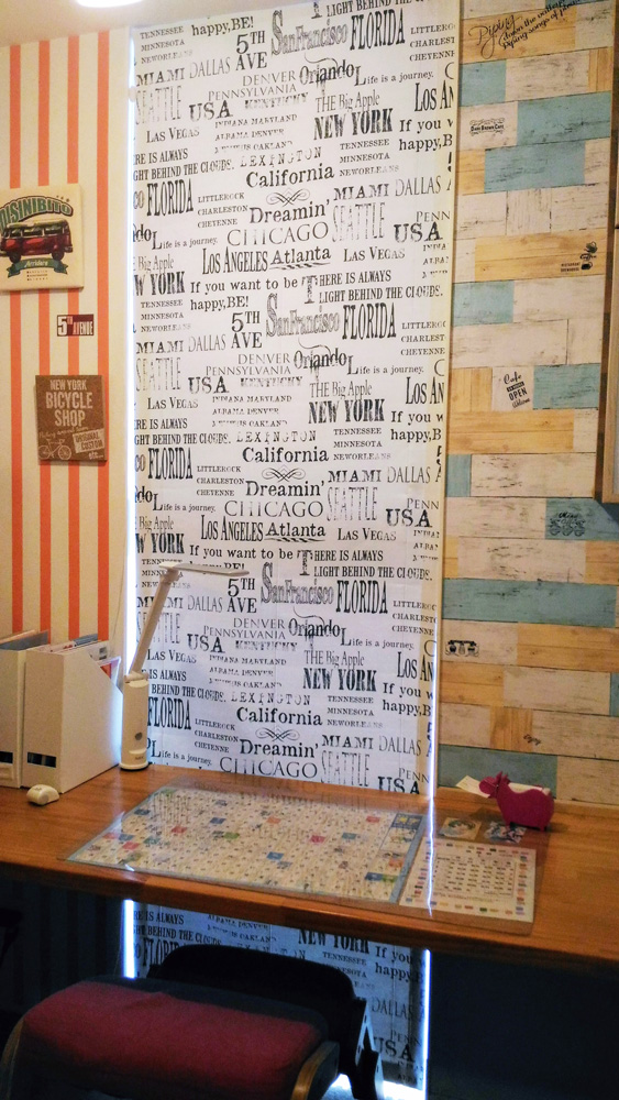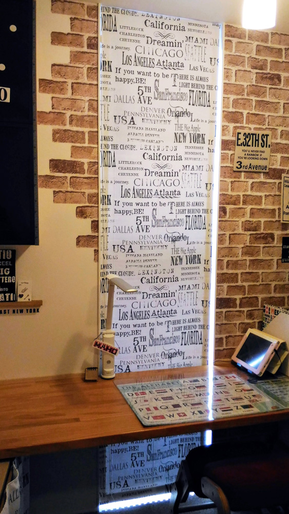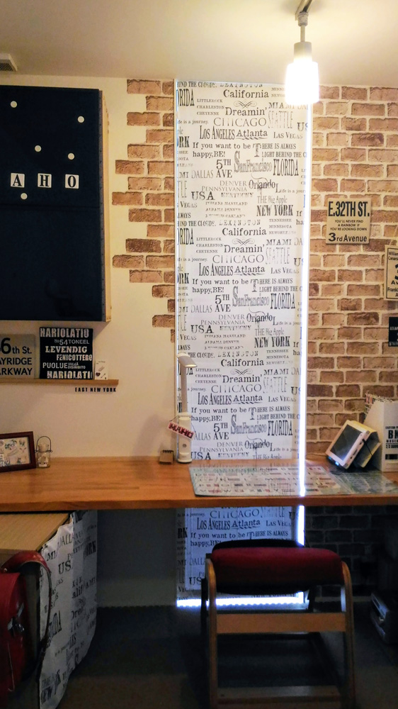 壁の木目やレンガのマスキング、配置された英文字のモチーフがアクセントになって上級者のトータルコーディネートが本当に素敵です(^^)*♪。*