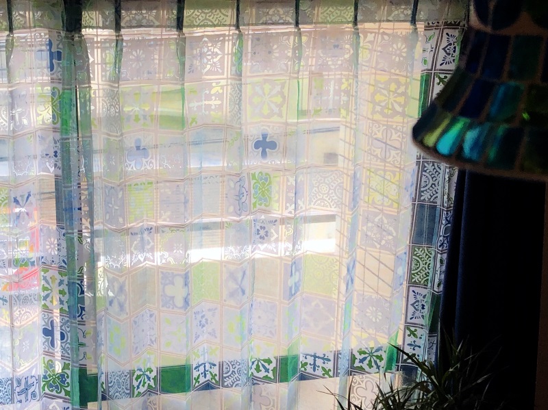 Four Seasonsの無地カーテンに合わせて、白無地レースからpatati patata のテトアン ライトブルーに替えました。