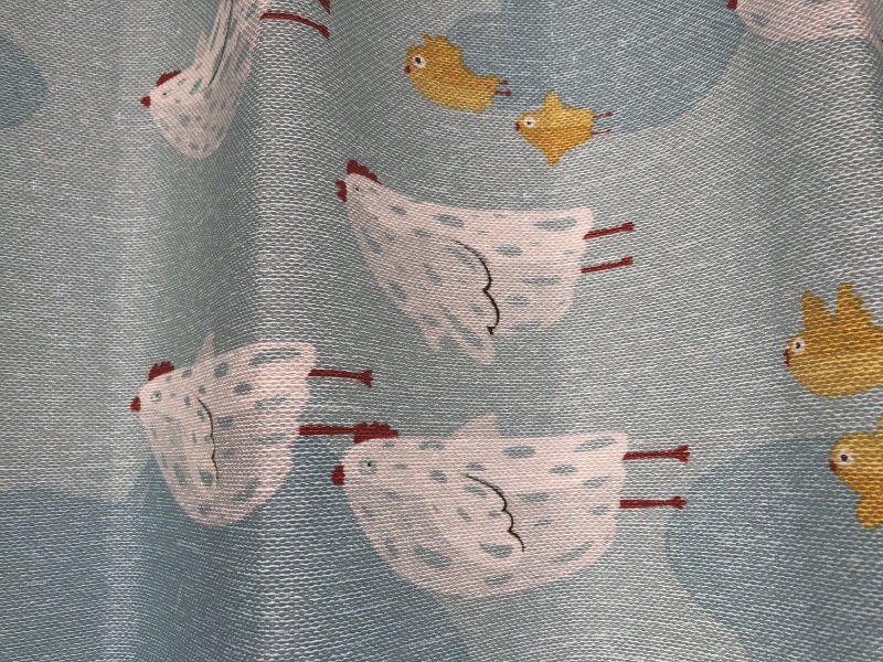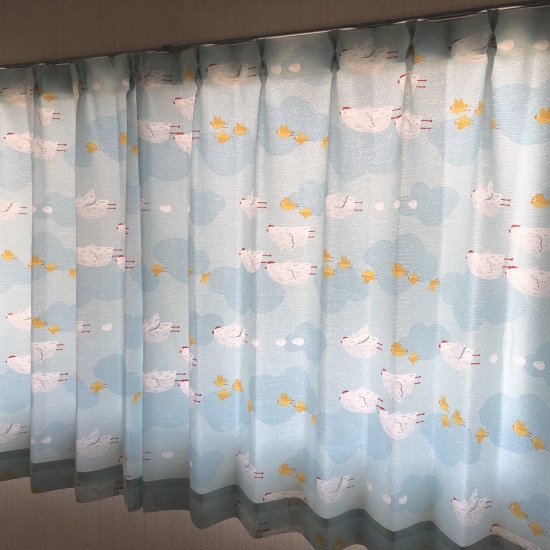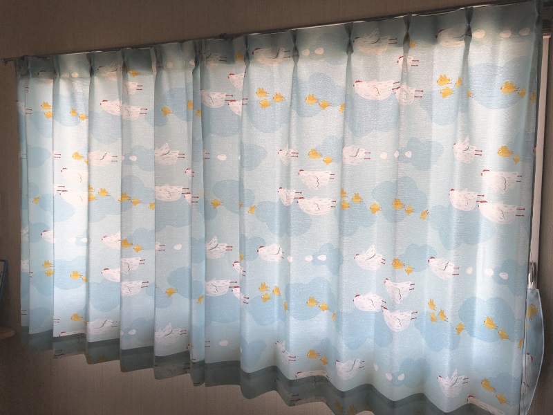 やさしく明るいブルーで、光も通すカーテンなのでお部屋を明るくできるのもいいですよね~。