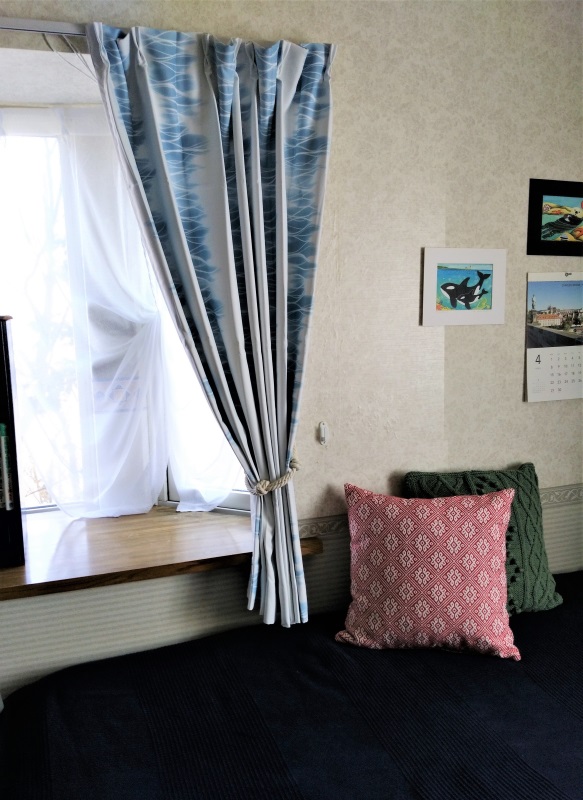 いつも無地のカーテンを選んでしまうのですが、思い切っていつもなら選ばない柄を、とこれにしました。もう片方の窓のカーテンがネイビーでマッチしているかなと思います。