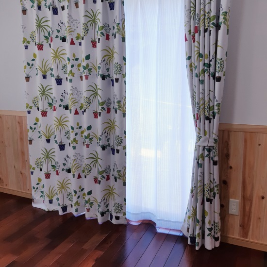 お客様にお選びいただいたこちらのカーテンはポップな色合いのポット柄で、