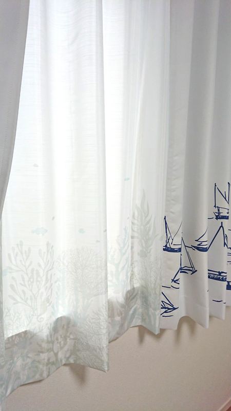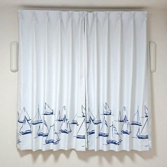 厚地カーテンの<ジャーニージャーニー>は裾の方にヨットの柄がプリントされた爽やかなデザインです。