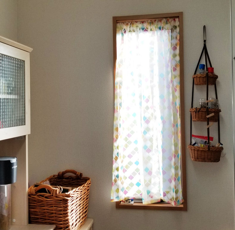 <レースルウェン ピンク>をキッチンの小窓にアレンジしていただいてます。