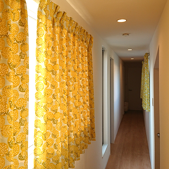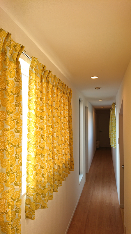 真っ白な壁紙に黄色が良く映え、廊下が明るくなりました。