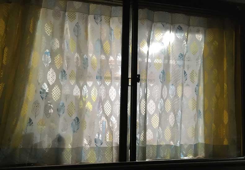 夜電気をつけると丸見えですが、ドレープカーテンを閉めれば大丈夫。