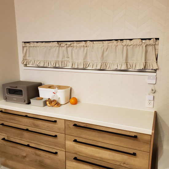 おしゃれなキッチンカウンターにカフェカーテンを合わせていただきました!