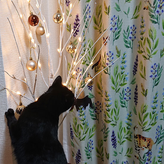 最初は無難に、無地に近い控えめなカーテンを考えていたのですが、ニャンダフルデイズに一目惚れ。
