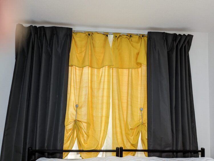 イージースタイルカーテンを寝室に取り付けてみました。店舗の方で購入したタッセルも取り付けてみたら味が 出てとてもいい感じです。 遮光カーテンとミラーカーテンの間に挟んで、ミラーカーテンに遮像効果がプラスされるのではないかと期待し ています。